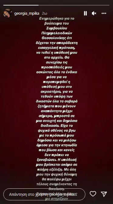 Στη συνέχεια, η Γεωργία Μπίκα, μέσω του δικηγόρου της, δηλώνει αποφασισμένη να φθάσει μέχρι τέλους, προκειμένου να δικαιωθεί: