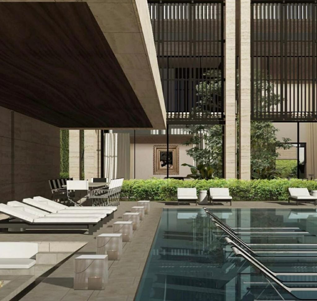 Στον εξωτερικό χώρο αυτό, που ξεχωρίζει, είναι η τεράστια πισίνα με τις πολλές λευκές ξαπλώστρες σε ζεύγη, αλλά και τα cozy σαλόνια κήπου, επίσης λευκά, όλα έτοιμα να υποδεχτούν τους φίλους και τους οικείους της οικογένειας.