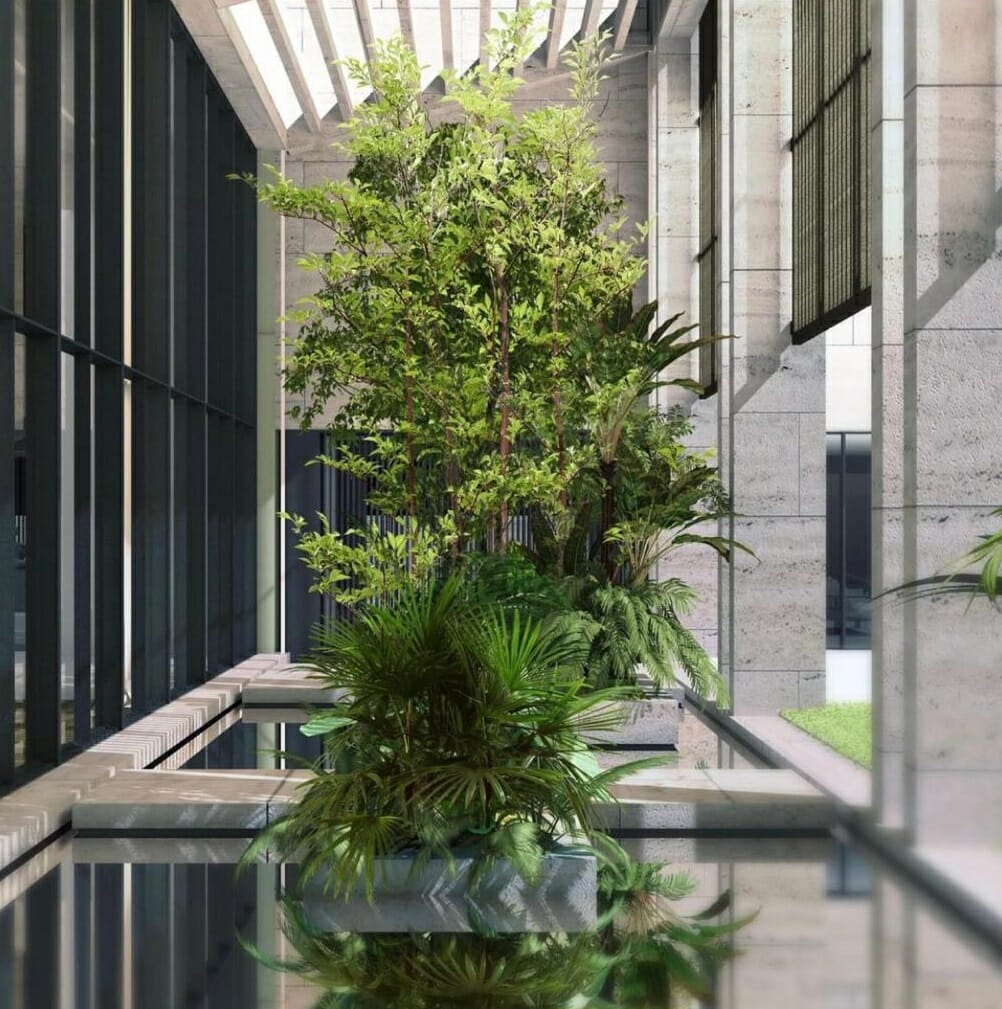 Επιπλέον δεν λείπουν οι ανάσες πρασίνου – θάμνοι, δένδρα και γκαζόν ομορφαίνουν το περιβάλλον, που θυμίζει κάτι από Ιαπωνία. Το γεωμετρικά συμμετρικό οίκημα έχει, επίσης, παντού τζαμαρίες και ειδικές κατασκευές, που επιτρέπουν το παιχνίδι με το φως – το σπίτι κυριολεκτικά «λούζεται» από τον ήλιο τις περισσότερες ώρες της ημέρας.
