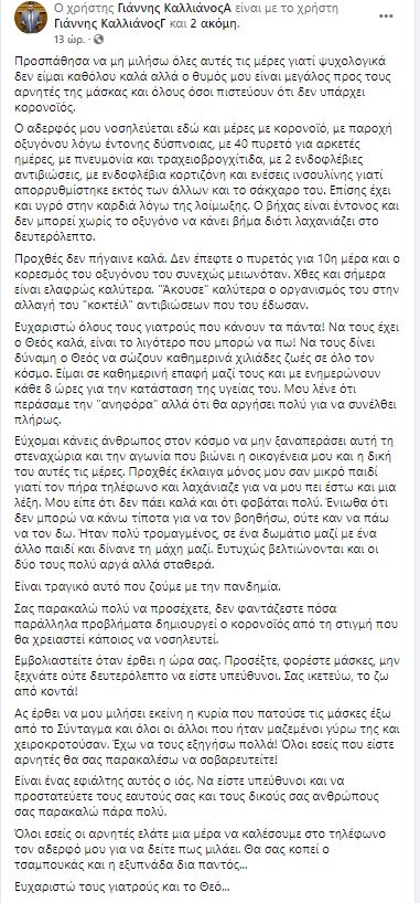Ο μετεωρολόγος εξήγησε μέσα από το Facebook πως η κατάσταση είναι κρίσιμη, αφού ο αδερφός του δεν μπορεί καν να μιλήσει κανονικά λόγω των αναπνευστικών προβλημάτων.