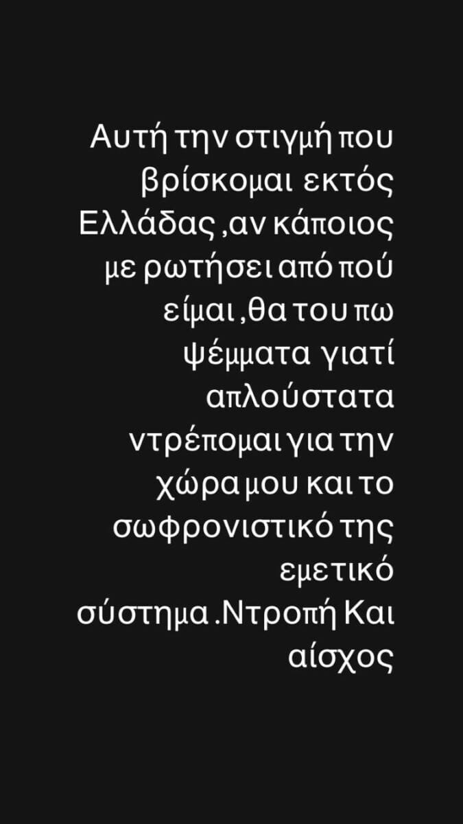 «Αυτή τη στιγμή που βρίσκομαι εκτός Ελλάδος, αν κάποιος με ρωτήσει από που είμαι, θα του πω ψέματα γιατί απλούστατα ντρέπομαι για τη χώρα μου και το σωφρονιστικό της, εμετικό σύστημα. Ντροπή και αίσχος».