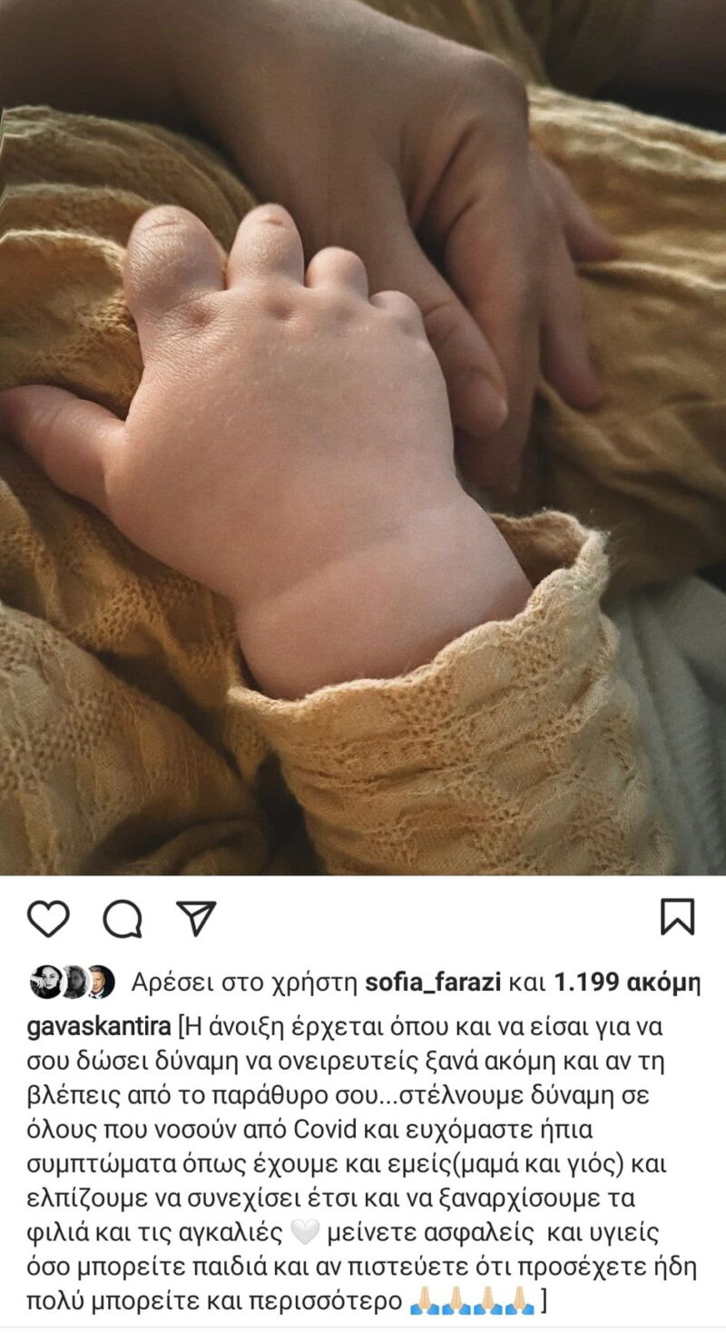 «Η άνοιξη έρχεται όπου και να είσαι για να σου δώσει δύναμη να ονειρευτείς ξανά ακόμη και αν τη βλέπεις από το παράθυρο σου…στέλνουμε δύναμη σε όλους που νοσούν από Covid και ευχόμαστε ήπια συμπτώματα όπως έχουμε και εμείς (μαμά και γιός) και ελπίζουμε να συνεχίσει έτσι και να ξαναρχίσουμε τα φιλιά και τις αγκαλιές, μείνετε ασφαλείς και υγιείς όσο μπορείτε παιδιά και αν πιστεύετε ότι προσέχετε ήδη πολύ μπορείτε και περισσότερο », έγραψε χαρακτηριστικά στο Instagram.