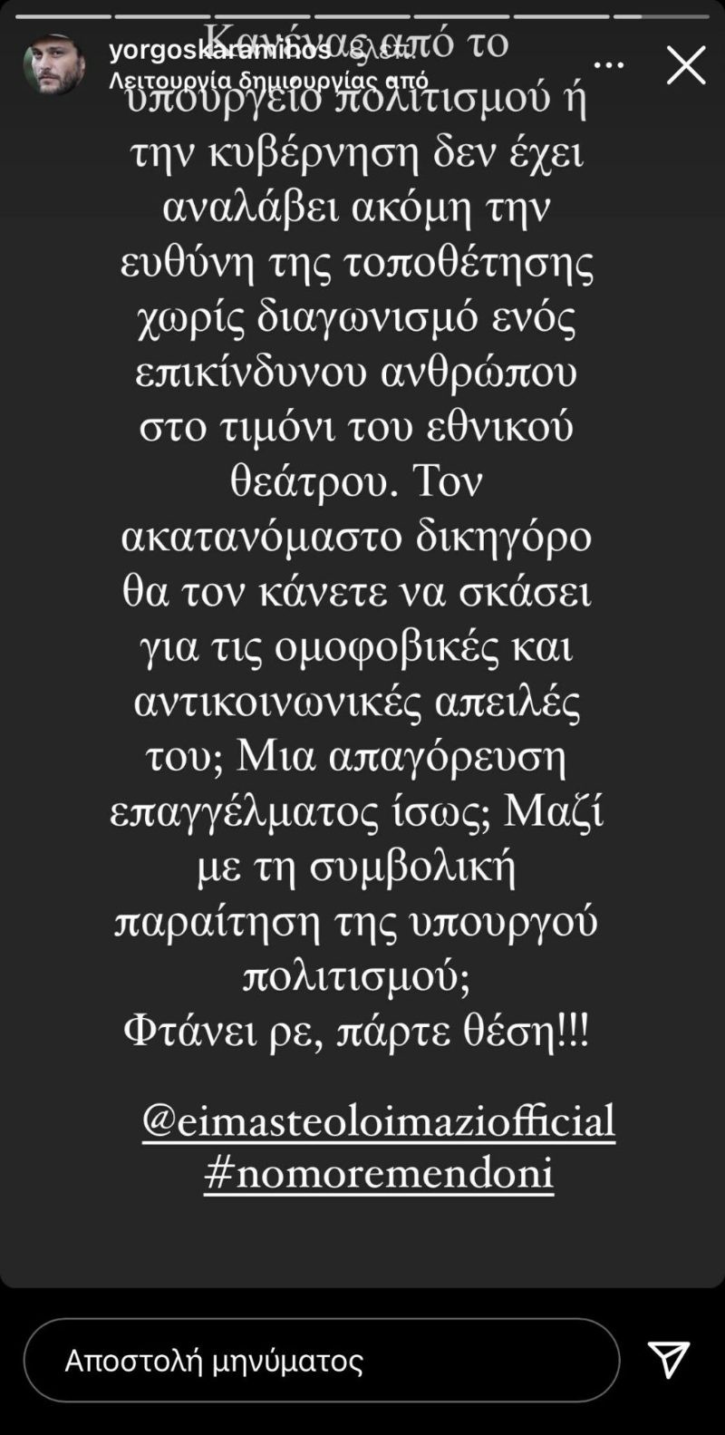 Με μια δημοσίευση στον  προσωπικό του λογαριασμό στο Instagram, ο Γιώργος Καραμίχος αποφάσισε να πάρει θέση στην υπόθεση του Δημήτρη Λιγνάδη.