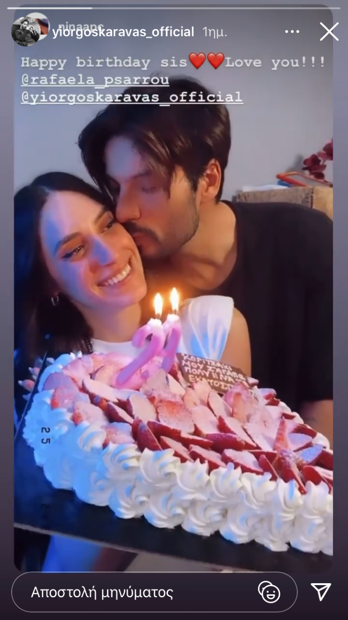 Ο Γιώργος Καράβας, με αφορμή τα γενέθλια της αγαπημένης του, ανέβασε τις νέες τους φωτογραφίες, ενώ η τούρτα της Ραφαέλας αποκάλυψε την ηλικία της. Η σύζυγος του γνωστού μοντέλου έγινε 29 ετών. Ενώ ο Γιώργος Καράβας φέτος θα γιορτάσει τα 39 του χρόνια.