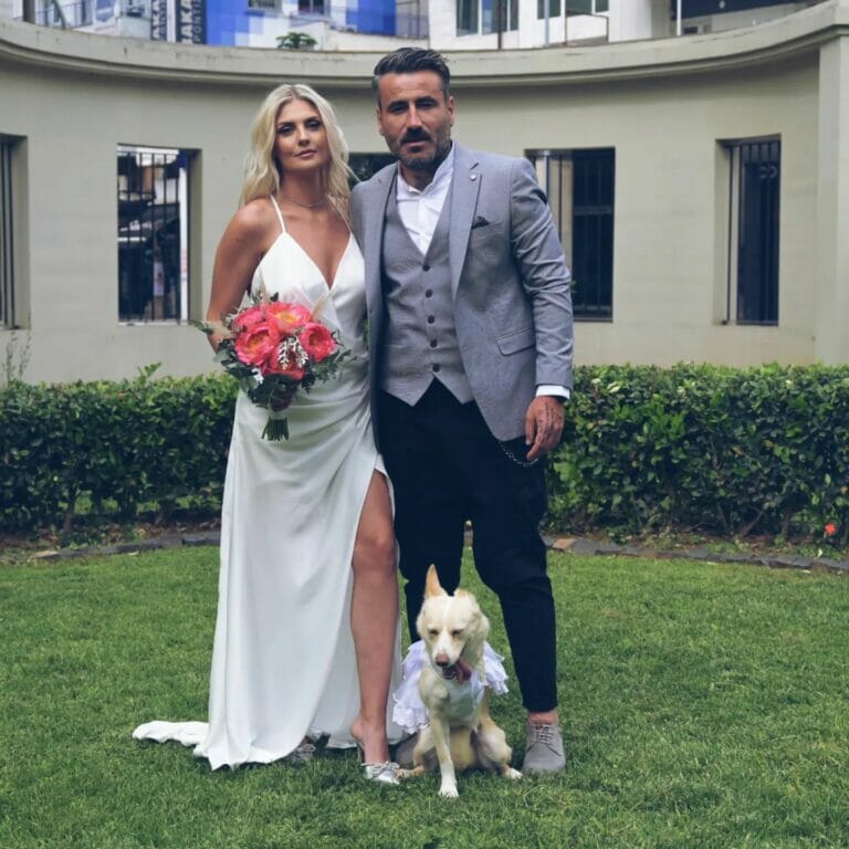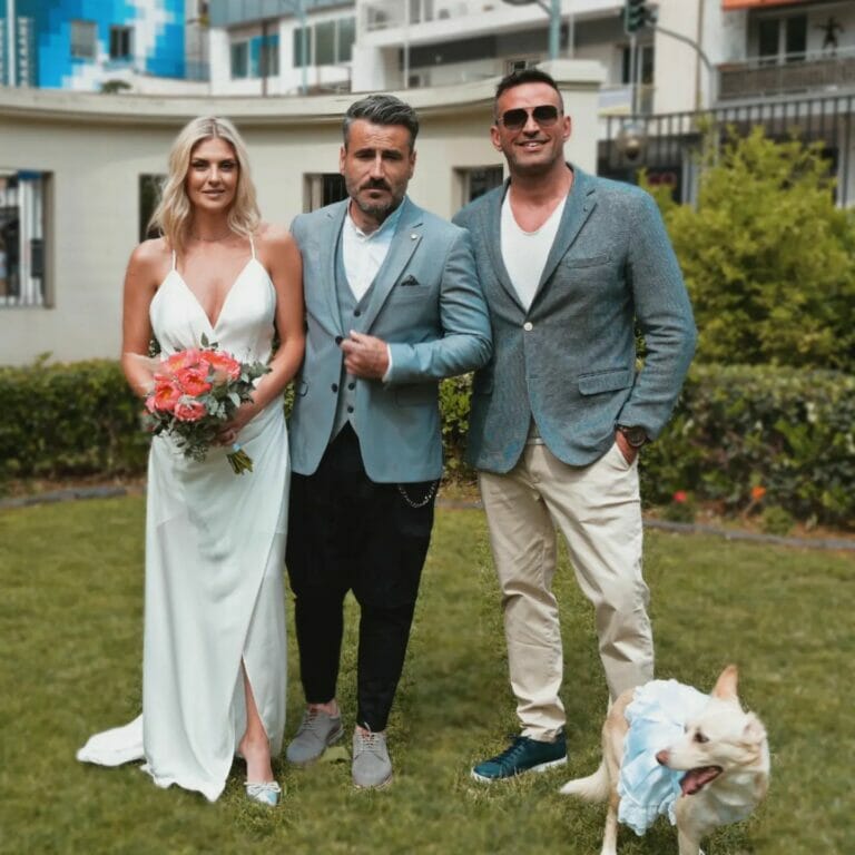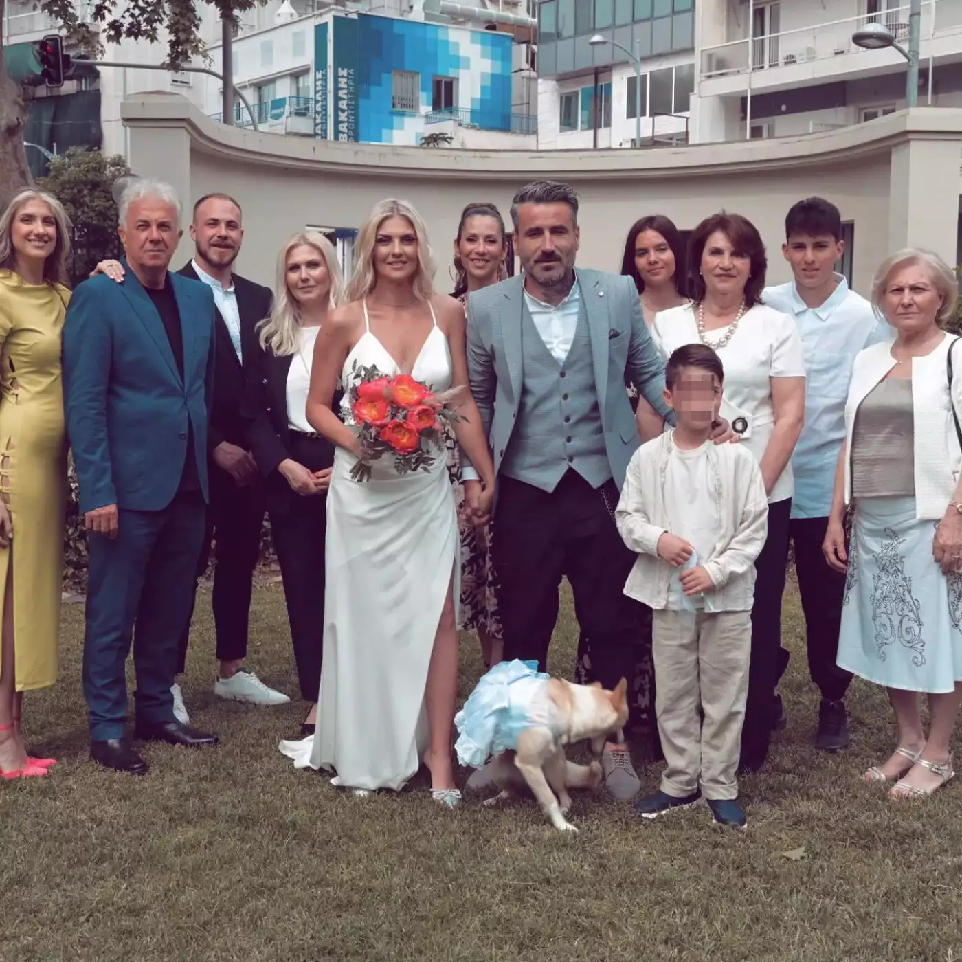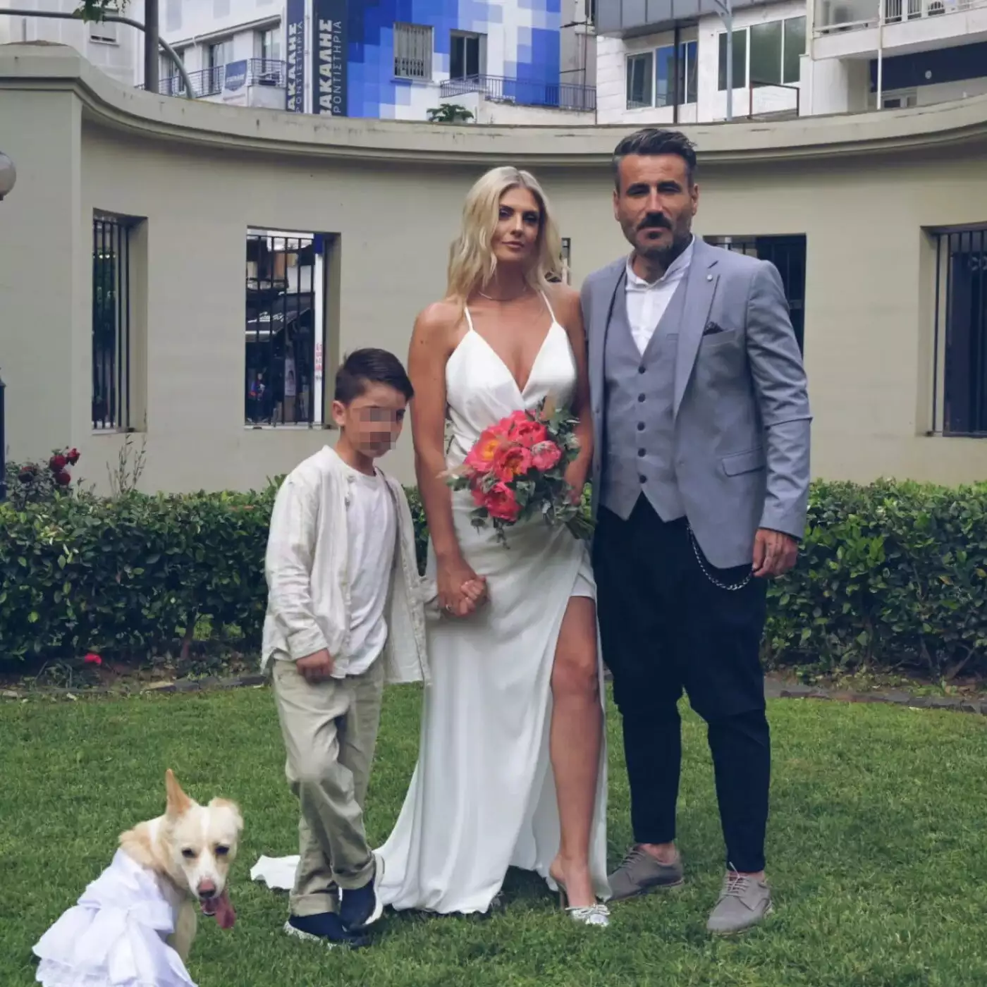 Τόσο αυτός όσο και την αγαπημένη του Κρίστη Καθάργια έλαμπαν από ευτυχία έχοντασ δίλα τουσ αγαπημένα τους πρόσωπα. Εκείνοι όμως που έκλεψαν τις εντυπώσεις ήταν τα παρανυφάκιανα που ήταν ο γιός της γοητευτικής ψυχολόγου και το σκυλάκι τους που είχαν ντύσει στα λευκά.