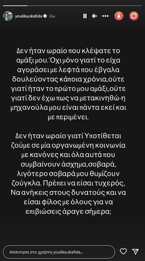 «Δεν ήταν ωραίο που κλέψατε το αμάξι μου. Όχι μόνο γιατί το είχα αγοράσει με λεφτά που έβγαλα δουλεύοντας κάποια χρόνια, ούτε γιατί ήταν το πρώτο μου αμάξι, ούτε γιατί δεν έχω πως να μετακινηθώ – η μηχανούλα μου είναι πάντα εκεί και με περιμένει. Δεν ήταν ωραίο γιατί υποτίθεται ζούμε σε μια οργανωμένη κοινωνία με κανόνες και όλα αυτά που συμβαίνουν άσχημα, σοβαρά, λιγότερο σοβαρά, μου θυμίζουν ζούγκλα. Πρέπει να είσαι τυχερός, να ανήκεις στους δυνατούς και να είσαι φίλος με όλους άραγε για να επιβιώσεις άραγε σήμερα;», έγραψε η Γιουλίκα Σκαφιδά.