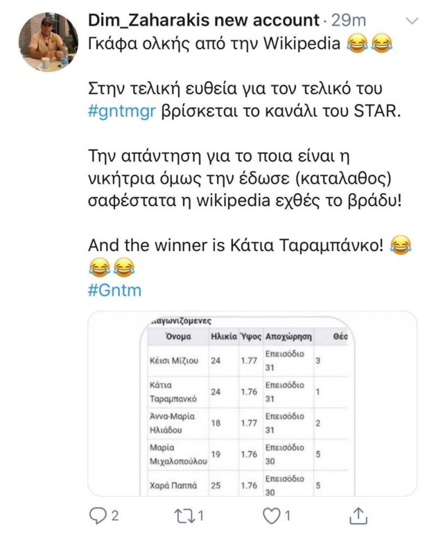 Και όμως το λάθος έγινε… Όπως ανακάλυψε χρήστης του Twitter η… ανακοίνωση της νικήτριας του GNTM ανακοινώθηκε στο Wikipedia, καθώς τα αποτελέσματα διέρρευσαν απογοητεύοντας τους φανατικούς του παιχνιδιού.