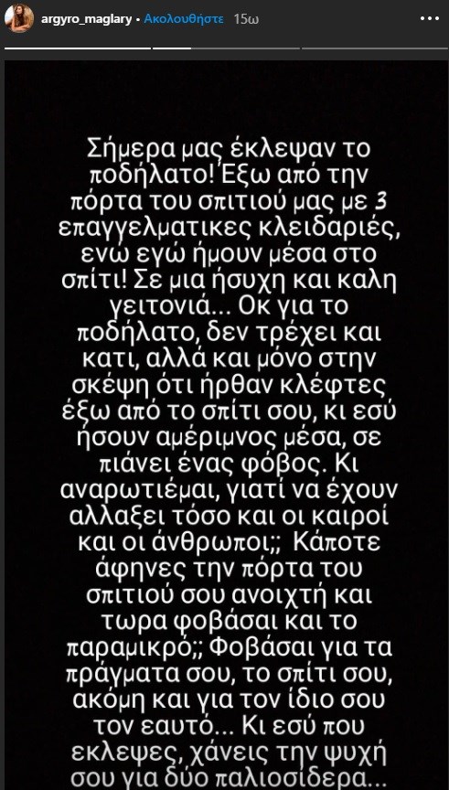 «Σήμερα μας έκλεψαν το ποδήλατο! Έξω από την πόρτα του σπιτιού μας με τρεις επαγγελματικές κλειδαριές, ενώ εγώ ήμουν μέσα στο σπίτι. Σε μια ήσυχη και καλή γειτονιά… Οκ για το ποδήλατο, δεν τρέχει και κάτι, αλλά μόνο στη σκέψη ότι ήρθαν οι κλέφτες έξω από το σπίτι σου και εσύ ήσουν αμέριμνος μέσα σε πιάνει ένας φόβος. Και αναρωτιέμαι… γιατί να έχουν αλλάξει τόσο οι καιροί και οι άνθρωποι; Κάποτε άφηνες την πόρτα του σπιτιού σου ανοιχτή και τώρα φοβάσαι και το παραμικρό;; Φοβάσαι για τα πράγματά σου, το σπίτι σου, ακόμα και για τον ίδιο σου τον εαυτό. Και εσύ που έκλεψες, χάνεις την ψυχή σου για δύο παλιοσίδερα», έγραψε το νεαρό μοντέλο.