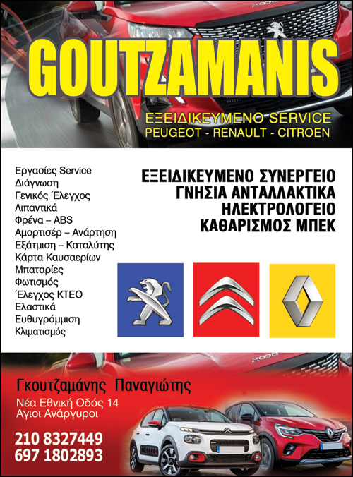 Το εξειδικευμένο συνεργείο GOUTZAMANIS προσφέρει εξειδικευμένο service σε αυτοκίνητα PEUGEOT – RENAULT – CITROEN και επιπλέον διαθέτει γνήσια ανταλλακτικά, ηλεκτρολογείο και κάνει καθαρισμό μπεκ.