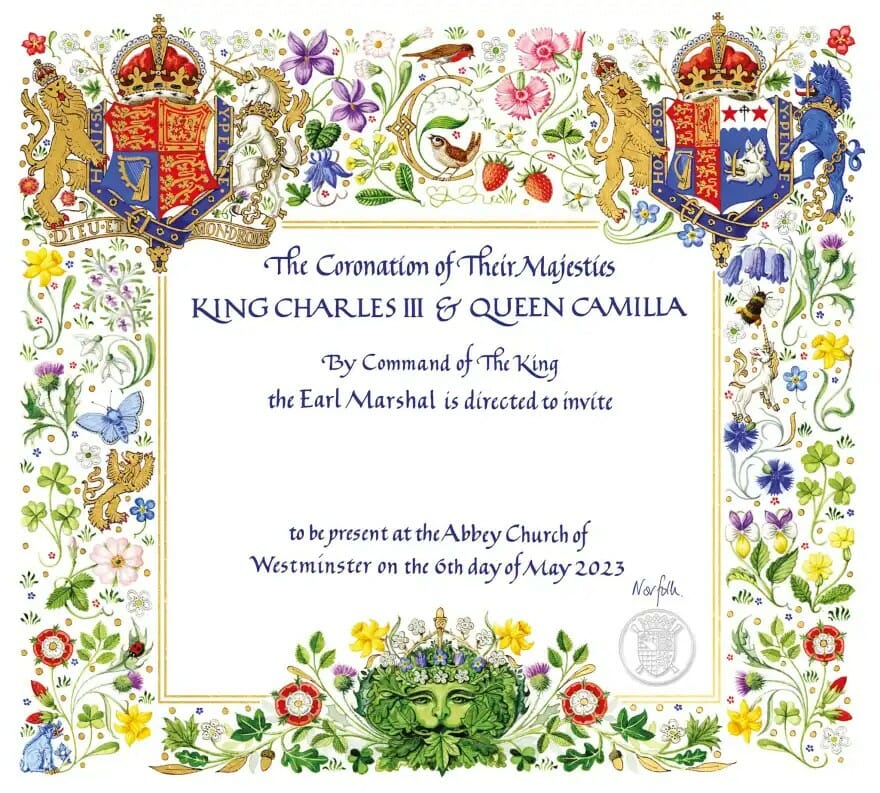 Η πρόσκληση για τη στέψη έχει σχεδιαστεί από τον Andrew Jamieson, εραλδικό καλλιτέχνη και εικονογράφο του οποίου το έργο είναι εμπνευσμένο από τα ιπποτικά θέματα του θρύλου του Arthurian. Αυτή δεν είναι η πρώτη φορά που καλλιτέχνης καλείται να σχεδιάσει κάτι για την βασιλική οικογένεια κι αυτό γιατί ανήκει στο προσωπικό του Γραφείου του Στέμματος.