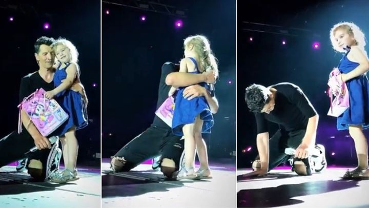 Την ώρα που τραγουδούσε μπροστά σε χιλιάδες Λαρισαίους, η ζωηρή, όπως φάνηκε εκ του αποτελέσματος, πιτσιρίκα, ανέβηκε επί σκηνής αφήνοντας άφωνο το διάσημο μπαμπά της.