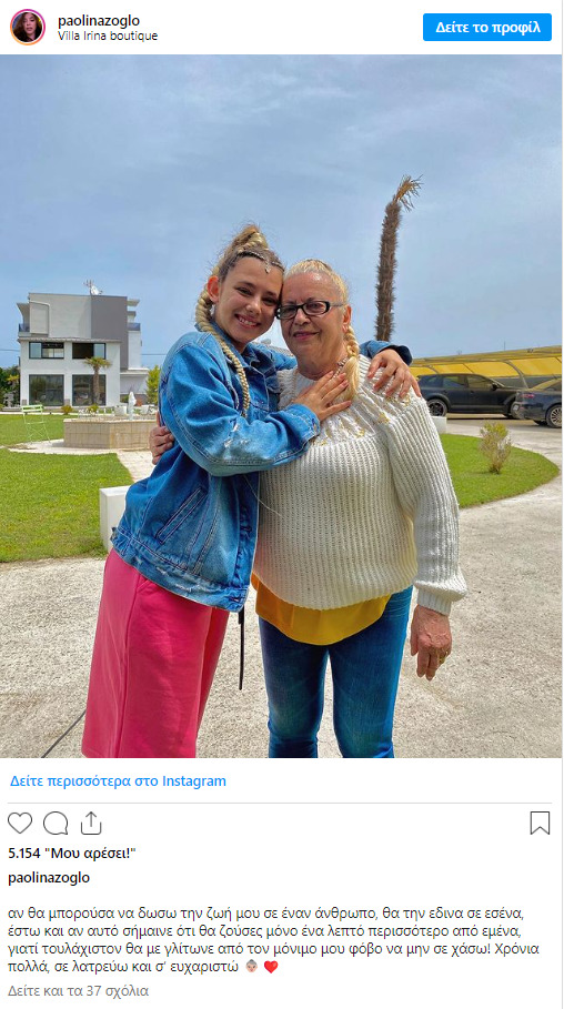 «Αν θα μπορούσα να δώσω την ζωή μου σε έναν άνθρωπο, θα την έδινα σε εσένα, έστω και αν αυτό σήμαινε ότι θα ζούσες μόνο ένα λεπτό περισσότερο από εμένα, γιατί τουλάχιστον θα με γλίτωνε από τον μόνιμο μου φόβο να μην σε χάσω! Χρόνια πολλά, σε λατρεύω και σ’ ευχαριστώ», είχε γράψει παλαιότερα η 20χρονη στο Ιnstagram, εκφράζοντας την αγάπη που τρέφει για τη γιαγιά της, η οποία την μεγάλωσε για να μπορέσει η Πάολα να κυνηγήσει το όνειρό της στο χώρο της μουσικής.