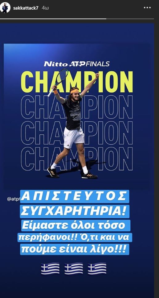 Όλη η Ελλάδα χαίρεται με την νίκη του Στέφανου Τσιτσιπά, και μέσα σε αυτούς που πανηγύριζαν ήταν και η παρτενέρ του στο μεικτό διπλό και πολύ καλή του φίλη, Μαρία Σάκκαρη. Η Ελληνίδα τενίστρια, που σε πρόσφατη συνέντευξή της στον Νίκο Χατζηνικολάου, είπε πως με τον τενίστα είναι απλά φίλοι, ανέβασε ένα ποστ στο Instagram, μέσα από το οποίο τον αποθεώνει για τη νίκη του στον τελικό του ATP Finals στο Λονδίνο. «Απίστευτος, συγχαρητήρια! Είμαστε όλοι τόσο περήφανοι!! Ότι και να πούμε είναι λίγο!!!» έγραψε χαρακτηριστικά η Ελληνίδα αθλήτρια που όπως φαίνεται κάνουν και παρέα εκτός γηπέδου.