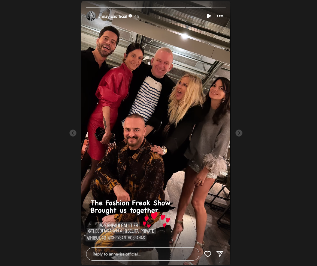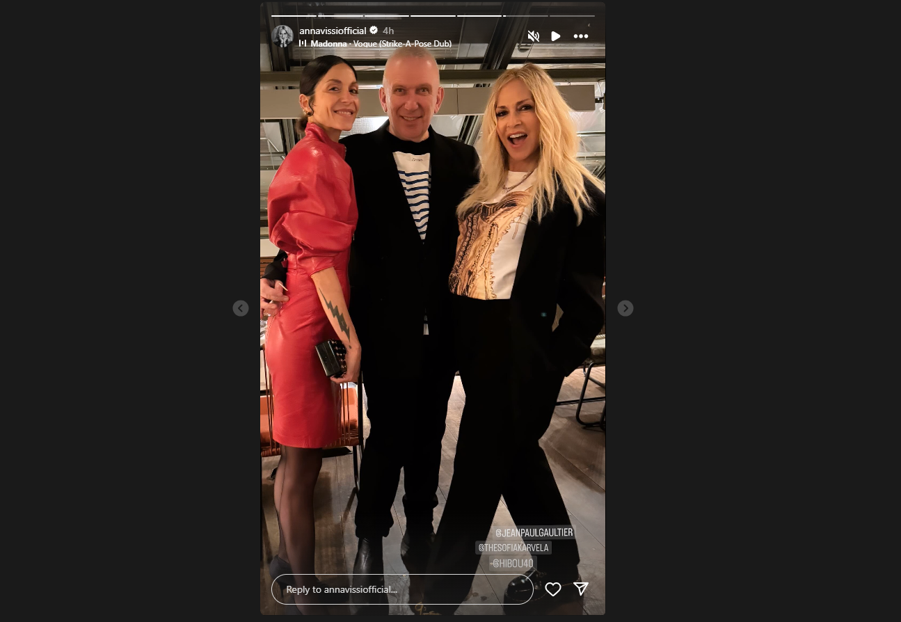 Μάλιστα, η Άννα Βίσση, η οποία είναι ιδιαίτερα ενεργή στα social media και συχνά δημοσιεύει στιγμές από την καθημερινότητά της στο Instagram, δημοσίευσε μερικά stories από τη βραδιά, ενθουσιάζοντας τους followers της. Στα κλικ, βλέπουμε και τον ίδιο τον Jean Paul Gaultier, με τον οποίο η Άννα Βίσση διατηρεί πολύ καλές σχέσεις.