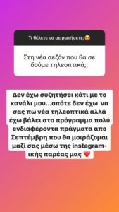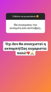 Η Αντελινα Βαρθακούρη απαντώντας σε ερώτηση θαυμαστή της στο instagram επιβεβαίωσε 100% το ρεπορτάζ μας για το οριστικό κόψιμο της εκπομπής της από το πρόγραμμα του Alpha και το άγνωστο μέλλον και στο κανάλι.