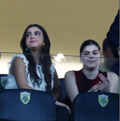 Οι κόρες του ζεύγους Ειρήνη και Ελένη Μαρινάκη παρακολούθησαν και εκείνες με αγωνία το ματς. Η μία κόρη φόρεσε λευκό τοπ με βολάν και η άλλη ένα αμάνικο τοπ σε μπορντώ απόχρωση.