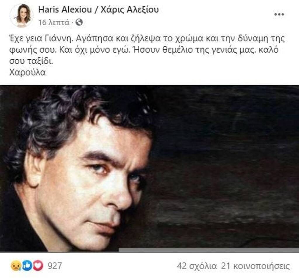 Με λόγια καρδιάς που συγκινούν, η Χαρούλα Αλεξίου αποχαιρετά τον Γιάννη Πουλόπουλο, που έφυγε χθες βράδυ  στο Αττικόν που νοσηλευόταν.Η ερμηνεύτρια μέσα από τα social media έκανε την δική της ανάρτηση γράφοντας  «Έχε γεια Γιάννη. Αγάπησα και ζήλεψα το χρώμα και την δύναμη της φωνής σου. Και όχι μόνο εγώ» σημειώνει χαρακτηριστικά η Χάρις Αλεξίου στο προφίλ που διατηρεί στο Faceook. «Ήσουν θεμέλιο της γενιάς μας. καλό σου ταξίδι. Χαρούλα» κατέληξε η ερμηνεύτρια στην τρυφερή της ανάρτηση.