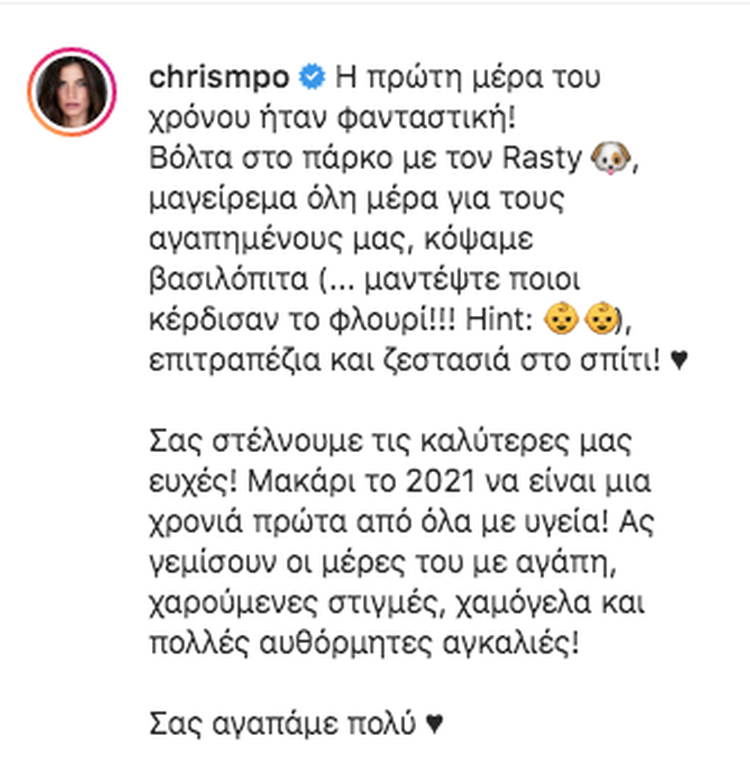 «Η πρώτη μέρα του χρόνου ήταν φανταστική! Βόλτα στο πάρκο με τον Rasty, μαγείρεμα όλη μέρα για τους αγαπημένους μας, κόψαμε βασιλόπιτα (… μαντέψτε ποιοι κέρδισαν το φλουρί!!! Hint: είναι δύο), επιτραπέζια και ζεστασιά στο σπίτι! Σας στέλνουμε τις καλύτερες μας ευχές! Μακάρι το 2021 να είναι μια χρονιά πρώτα από όλα με υγεία! Ας γεμίσουν οι μέρες του με αγάπη, χαρούμενες στιγμές, χαμόγελα και πολλές αυθόρμητες αγκαλιές! Σας αγαπάμε πολύ», έγραφε στο caption των φωτογραφιών που ανέβασε στο account της.
