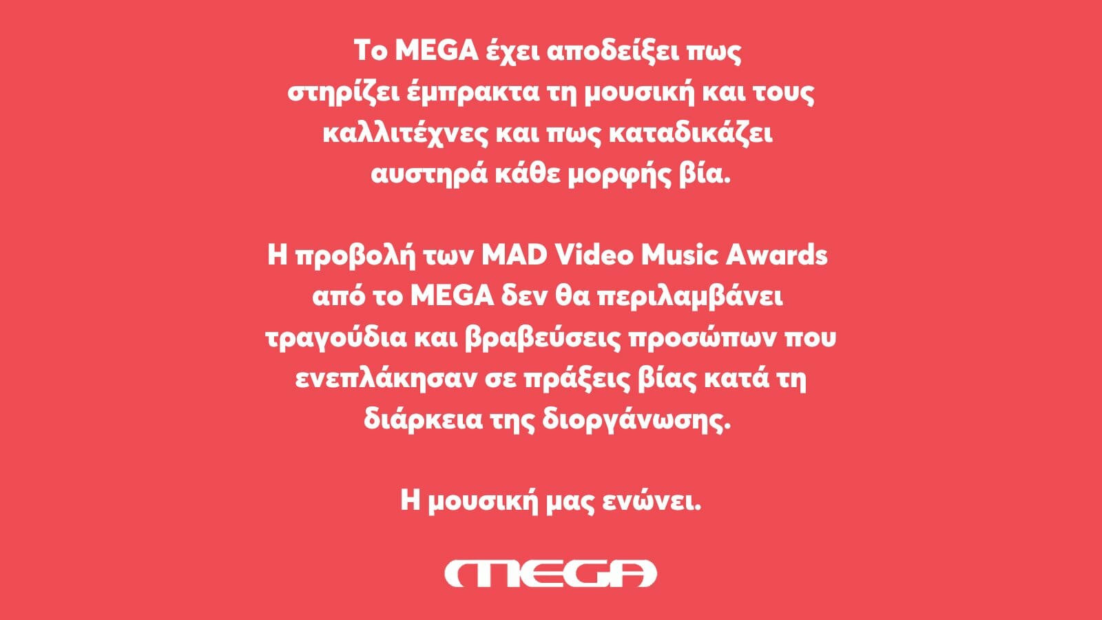 «Το MEGA έχει αποδείξει πως στηρίζει έμπρακτα τη μουσική και τους καλλιτέχνες και πως καταδικάζει αυστηρά κάθε μορφή βίας. Η προβολή των MAD Video Music Awards από το MEGA δεν θα περιλαμβάνει τραγούδια και βραβεύσεις των προσώπων που ενεπλάκησαν σε πράξεις βίας κατά τη διάρκεια της διοργάνωσης».