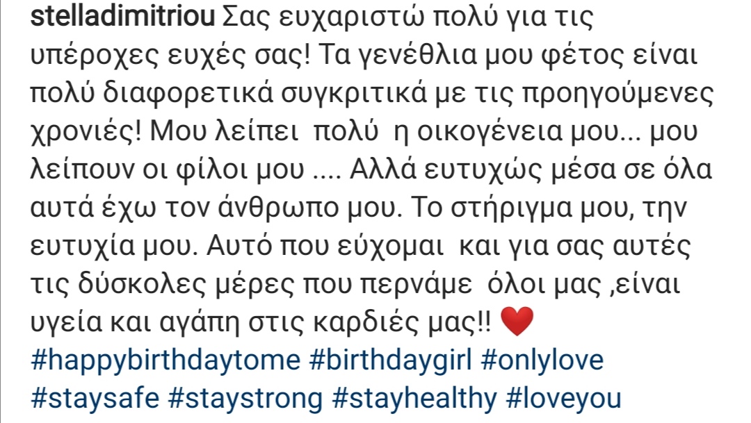 Τα φετινά της γενέθλια μπορεί να ήταν διαφορετικά λόγω της καραντίνας, αλλά αυτό δεν φαίνεται να χάλασε τη διάθεση της Στέλλας Δημητρίου, αφού τα πέρασε με τον άνδρα της ζωής της, τον επιχειρηματία Δημήτρη Μιχαηλίδη.