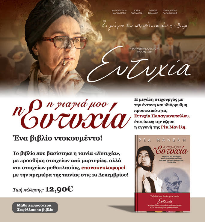 Το βιβλίο της Ρέας Μανέλη με τίτλο” Η γιαγιά μου η Ευτυχία”, που βασίστηκε η ταινία ” Ευτυχία” με πρόσθετα στοιχεία από μαρτυρίες αλλά και στοιχεία μυθοπλασίας, θα βρίσκεται και πάλι στις προθήκες των βιβλιοπωλείων. Η Ρέα Μανέλη με πατέρα τον δημοφιλή κωμικό Φραντζέσκο Μανέλη και μητέρα την ηθοποιό Μαίρη Λαϊδου ακολούθησε και αυτή τον δρόμο που είχαν χαράξει οι γονείς της αλλά και η γιαγιά της. Όταν η Ρέα έφτασε στη σχολική ηλικία ο παππούς της Γιώργος Παπαγιαννόπουλος, ο δεύτερος και αγαπημένος σύζυγος της Ευτυχίας, κάλεσε σε συμβούλιο τους γονείς της δίνοντάς τους τελεσίγραφο: “Η σταματάτε τις τουρνέ, το θέατρο και τα ξενύχτια για το παιδί, και μένει κοντά μας και μεγαλώνει σαν όλα τα παιδιά της ηλικίας του, κι εσείς συνεχίζετε τις τουρνέ και τη ζωή σας ή το παίρνετε μαζί σας και φεύγετε από το σπίτι… Μετά από λίγο διάστημα η Ρέα καταλήγει να μείνει στο σπίτι του παππού και της γιαγιάς. Η ίδια αφηγείται στο βιβλίο…