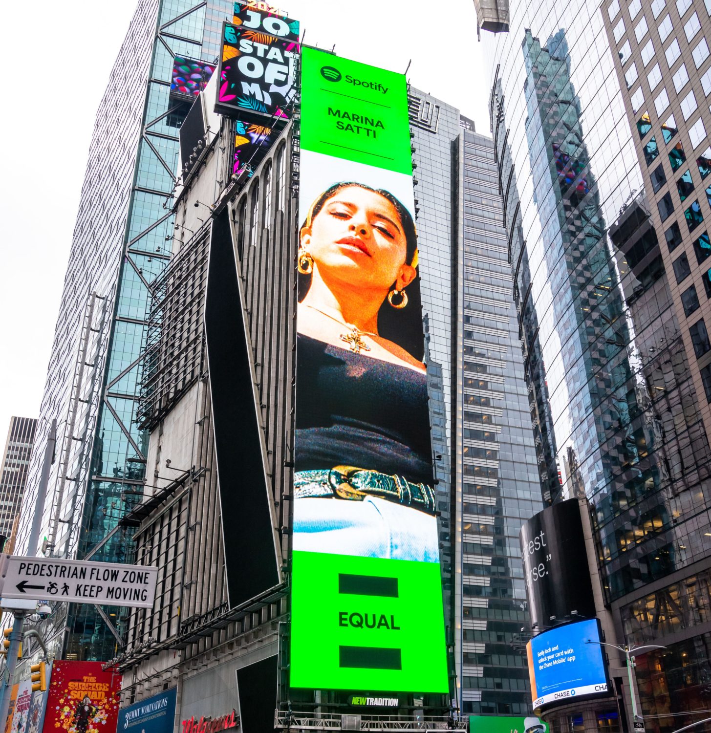 Η Μαρίνα Σάττι έγινε το πρόσωπο της Ελλάδας στην παγκόσμια καμπάνια του Spotify. Δυο μήνες μετά την σαρωτική επιτυχία του “ΠΑΛΙ”, η Μαρίνα Σάττι μπήκε σε billboard στην Times Square της Νέας Υόρκης! Η διεθνής διάκριση προέκυψε καθώς, η Μαρίνα Σάττι έγινε η ambassador Ελλάδας στην παγκόσμια καμπάνια SpotifyEQUAL, για την ισότητα των φύλων και την γυναικεία ενδυνάμωση.