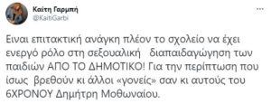 «Είναι επιτακτική ανάγκη πλέον το σχολείο να έχει ενεργό ρόλο στη σεξουαλική διαπαιδαγώγηση των παιδιών ΑΠΟ ΤΟ ΔΗΜΟΤΙΚΟ! Για την περίπτωση που ίσως βρεθούν κι άλλοι «γονείς» σαν κι αυτούς του 6ΧΡΟΝΟΥ Δημήτρη Μοθωναίου».
