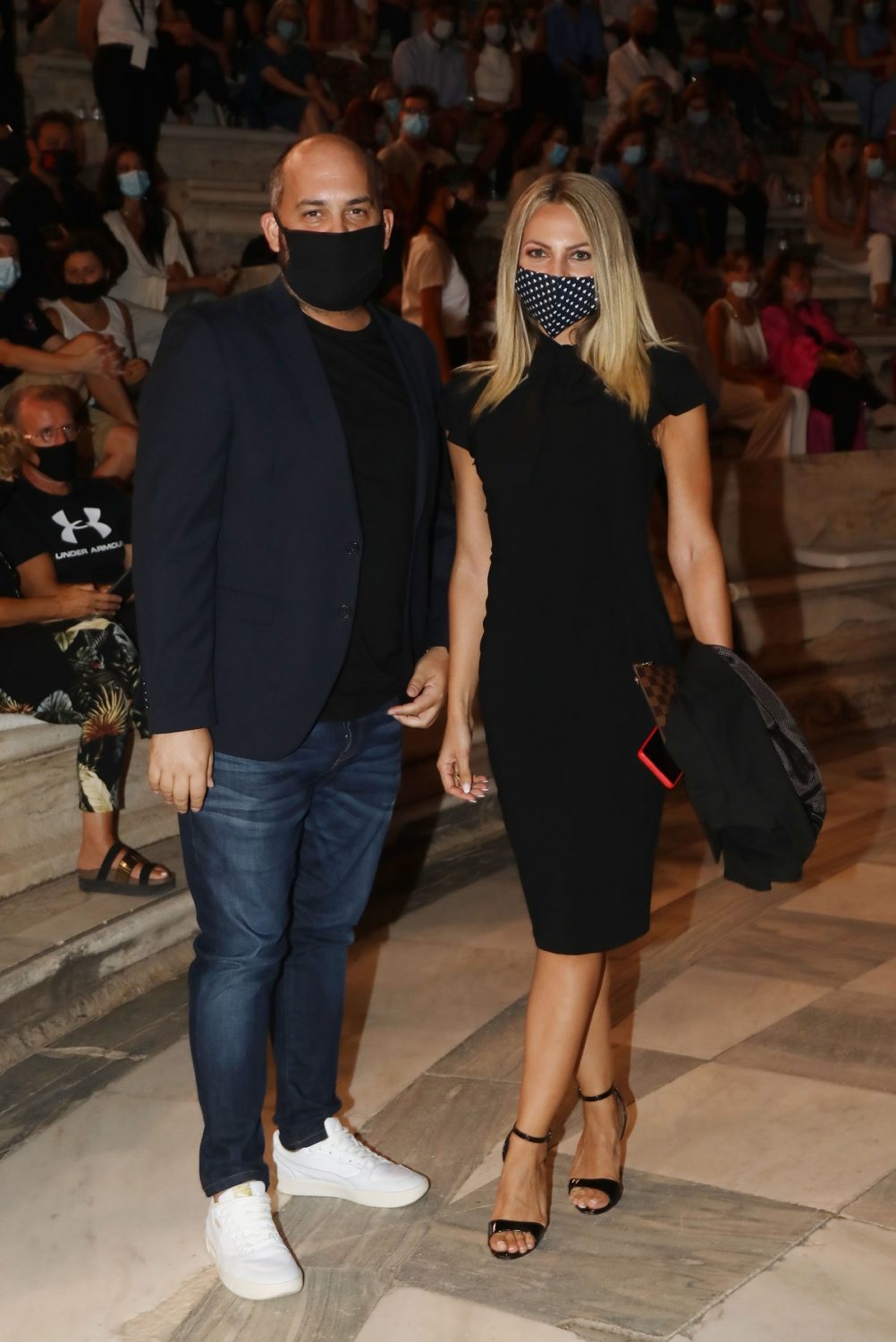 Στο Ηρώδειο παραβρέθηκε η παρουσιάστρια με ένα total black σύνολο. Το οποίο αποτελούνταν από ένα μαύρο μίντι φόρεμα, ένα μαύρο σακάκι, μαύρα πέδιλα και ένα τσαντάκι με τετράγωνα σχέδια σε καφέ και μπορντό χρώμα. Τα μαλλιά της απλά κάτω και το μακιγιάζ της φυσικό.