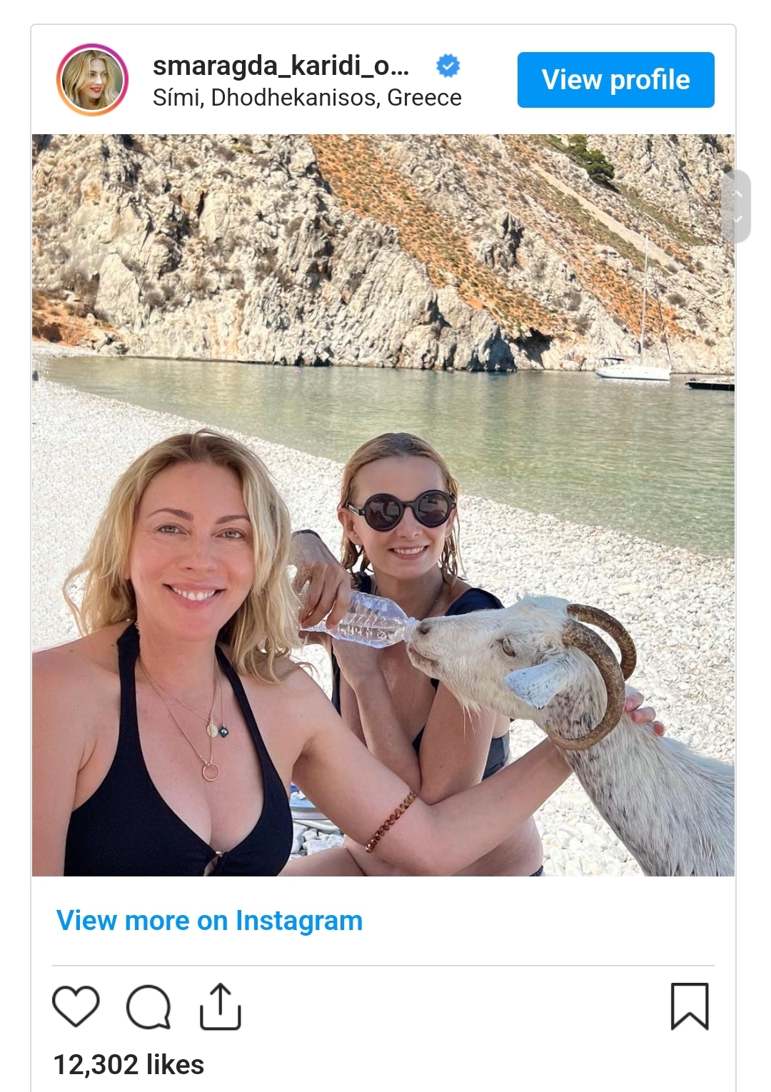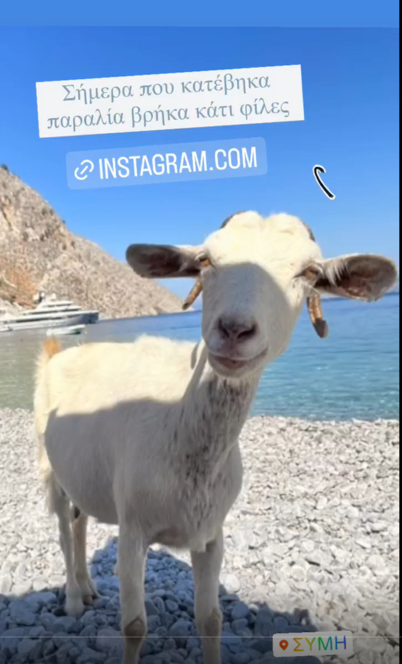 Το τετράποδο κυκλοφορούσε στην παραλία της Σύμης και πλησίασε την Σμαράγδα Καρύδη και την παρέα της με εκείνους να της προσφέρουν λιχουδιές αλλά και δροσερό νερό με την κατσίκα να επιστρέφει ξανά στην στάνη της ύστερα από μία γρήγορη γνωριμία με την showbiz και τα social media.