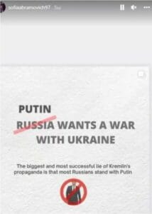 Μπορεί για τους περισσότερους να είναι η κόρη του Ρώσου μεγιστάνα Ρομάν Αμπράμοβιτς. Η 27χρονη Σοφία Αμπράμοβιτς, που περνά μεγάλο μέρος της ζωής της στο Λονδίνο, ανέβασε φωτογραφία στο Instagram και καταδικάζει τον Βλαντίμιρ Πούτιν για την εισβολή στην Ουκρανία.Στη φωτογραφία έγραψε: «Το μεγαλύτερο και πιο επιτυχημένο ψέμα της προπαγάνδας του Κρεμλίνου είναι ότι οι περισσότεροι Ρώσοι στέκονται στο πλευρό του Πούτιν».
