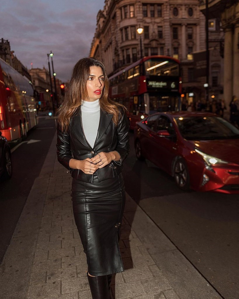 Η ηθοποιός φόρεσε μια δερμάτινη μίντι φούστα με δερμάτινο blazer τα οποία συνδύασε με λευκό πουλόβερ και ψηλοτάκουνες μαύρες μπότες.