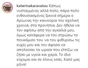 «Κάπως νυσταγμένος αλλά πολύ, πάρα πολύ ενθουσιασμένος ξεκινά σήμερα ο Αρίωνας την καινούρια του σχολική χρονιά, στα προνήπια. Δεν ήθελα να τον αφήσω από την αγκαλιά μου, όμως κατάφερα να του στρώσω το πουκάμισο του, να του ψιθυρίσω τις ευχές μου και τον άφησα να απολαύσει τα ωραία που ελπίζω να ζήσει με υγεία και χαρά. Το ίδιο εύχομαι και σε όλους εσάς. Καλό μας μήνα!» έγραψε η Κατερίνα Καραβάτου, ανεβάζοντας στο Instagram ένα στιγμιότυπο, στο οποίο τη βλέπουμε να κρατάει στην αγκαλιά της τον 4χρονο Αρίωνα.