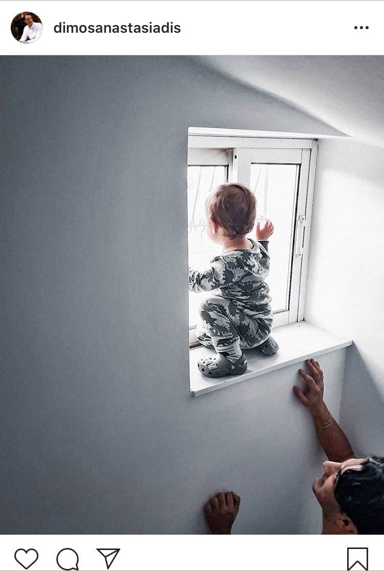 «Σε στρατόπεδο απο-συγκέντρωσης» αναφέρει για τη δεύτερη καραντίνα τριών εβδομάδων και η Τζένη τον φωτογραφίζει τη στιγμή που έχει ανεβάσει τον γιο τους σε ένα από τα παράθυρα του σπιτιού τους για να κοιτάξει έξω, ενώ εκείνος σαν προστατευτικός πατέρας που είναι στέκεται ακριβώς από κάτω.