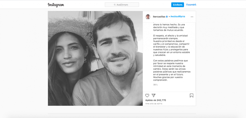 Το τέλος της κοινής τους συμβίωσης και του έγγαμου βίου τους ανακοίνωσαν από κοινού μέσω των social media, ο Ίκερ Κασίγιας και η Σάρα Καρμπονέρο: «Μαζί η Σάρα και εγώ νιώθουμε απίστευτα υπερήφανοι για την οικογένεια που έχουμε, αλλά και για την ευκαιρία που είχαμε να μοιραστούμε μία αγάπη που μας γέμισε χαρά όλα αυτά τα χρόνια που ήμασταν μαζί.