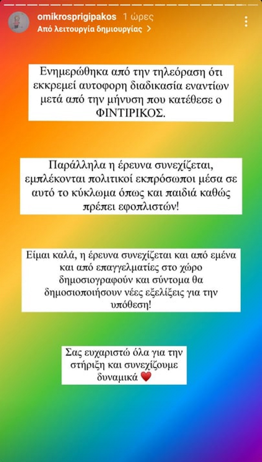 Μόλις ο ακτιβιστής ενημερώθηκε ότι εκκρεμεί αυτόφωρο εξαιτίας της μήνυσης που του κατατέθηκε από τον Δημήτρη Φιντιρίκο έστειλε το δικό του μήνυμα μέσα από Instagram του.