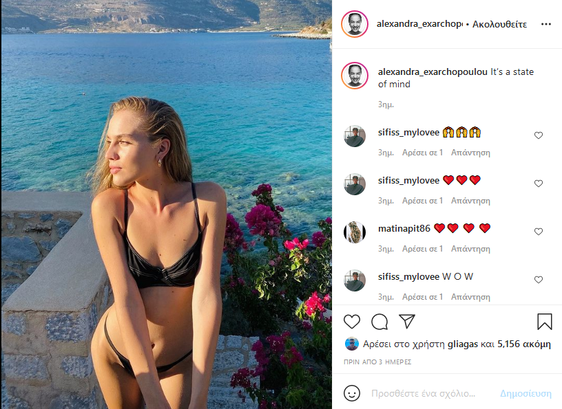 Ωστόσο, η σύντροφος του Αλεξάνδρα Εξαρχοπούλου έχει γίνει γνωστή από τη συμμετοχή στης στο GNTM. Πρόσφατα δημοσίευσε μέσα από τον προσωπικό της λογαριασμό της στο Instagram μια φωτογραφία τους.