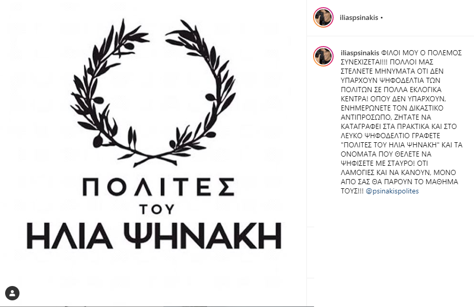 Ο Ηλίας εξερράγη και έγραψε στα social media: «Φίλοι μου ο πόλεμος συνεχίζεται!!! Πολλοί μας στέλνετε μηνύματα ότι δεν υπάρχουν ψηφοδέλτια των πολιτών σε πολλά εκλογικά κέντρα! Όπου δεν υπάρχουν, ενημερώνετε τον δικαστικό αντιπρόσωπο, ζητάτε να καταγραφεί στα πρακτικά και στο λευκό ψηφοδέλτιο γράφετε “Πολίτες του Ηλία Ψηνάκη” και τα ονόματα που θέλετε να ψηφίσετε με σταυρό! Ότι λαμογιές και να κάνουν, μόνο από σας θα πάρουν το μάθημά τους!!!».