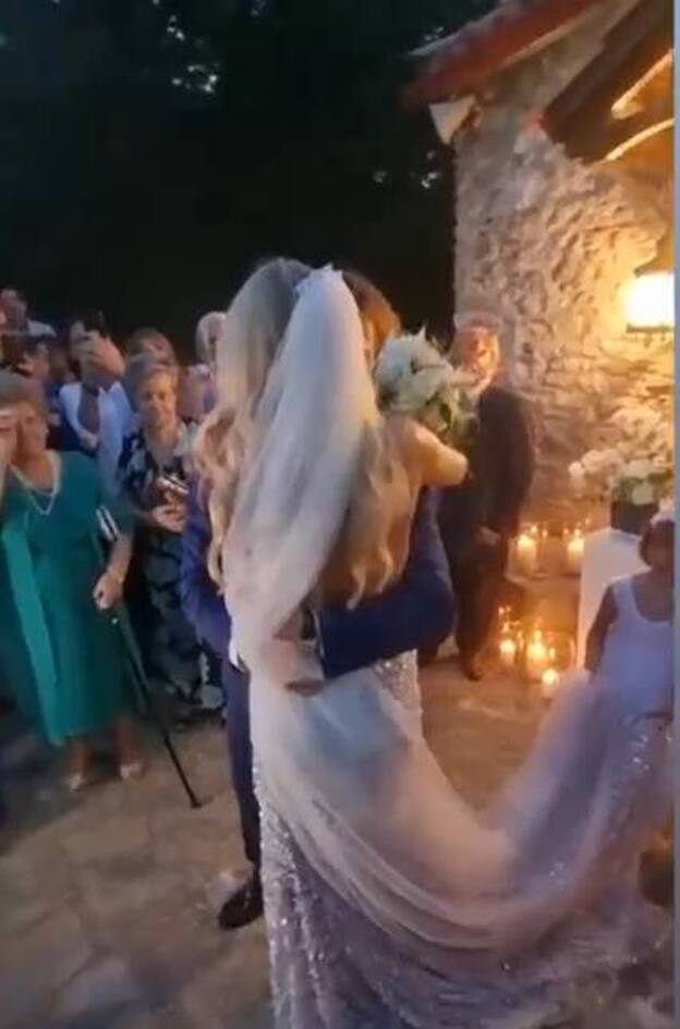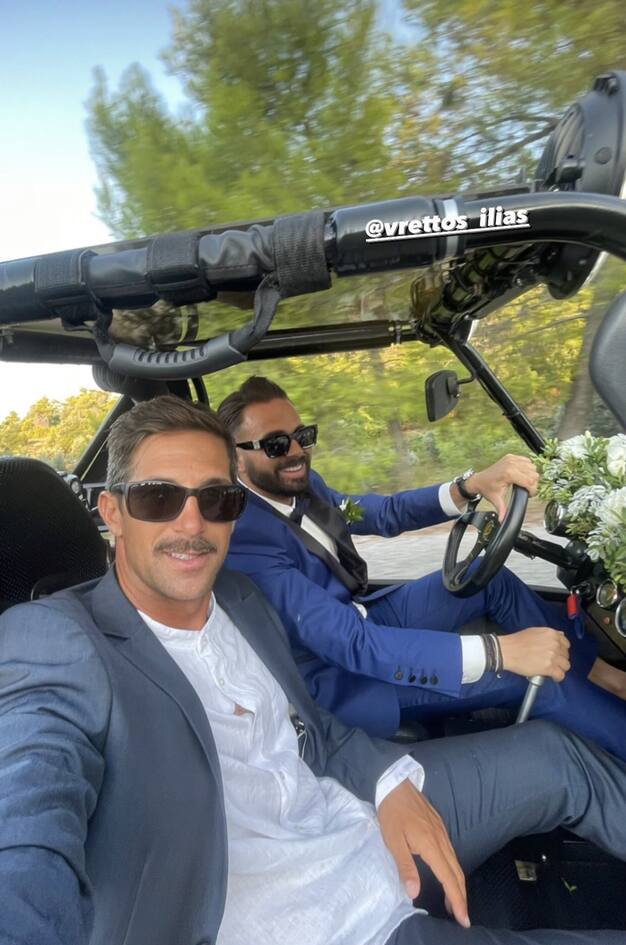 Λίγο πριν ανέβουν τα σκαλιά της εκκλησίας, ο Ηλίας Βρεττός και η σύντροφός του, Αναστασία Δεληγιάννη ξεφαντώνουν στην Κύμη.