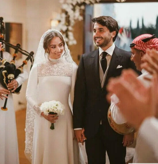 Η νύφη, έφτασε στον χώρο με ένα λευκό φόρεμα με δαντελένιο πέπλο συνοδευόμενη από τον αδερφό της, πρίγκιπα Χουσεϊν. Από την πλευρά του, ο γαμπρός την υποδέχτηκε φορώντας κουστούμι που θύμιζε βρετανικό λουκ.