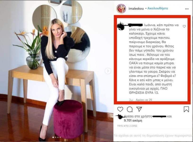 «Ιωάννα, κάτι πρέπει να γίνει για να μείνει ο Χεζόνια το καλοκαίρι. Έχουμε κάνει υποδοχή, τρέχουμε παντού, παίρνουμε διαρκείας, θα πάρουμε και του χρόνου. Φέτος δεν πάμε γήπεδο, του χρόνου ίσως πάμε, θέλουμε να του κάνουμε κερκίδα, να αράξουμε στο ΟΑΚΑ, να πιούμε καμιά μπύρα και να γλεντάμε τον γαύρο. Σκέψου να είσαι στα επίσημα ε; Φοβερό ε; Κάνε και εσύ κάτι μπας και μείνει. Είναι καλό παιδί, από σωστή οικογένεια, με αρχές. ΠΑΟ ΘΡΗΣΚΕΙΑ ΘΥΡΑ 13», αναφέρει το σχόλιο του φίλου του «τριφυλλιού» στο προφίλ της Ιωάννας Μαλέσκου.