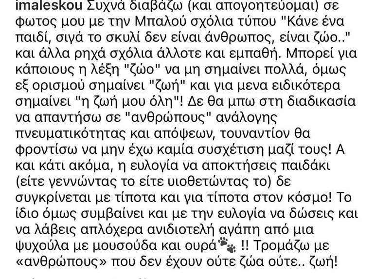 “Συχνά διαβάζω (και απογοητεύομαι) σε φωτος μου με την Μπαλού σχόλια τύπου “Κάνε ένα παιδί, σιγά το σκυλί δεν είναι άνθρωπος, είναι ζώο..” και άλλα ρηχά σχόλια άλλοτε και εμπαθή.
