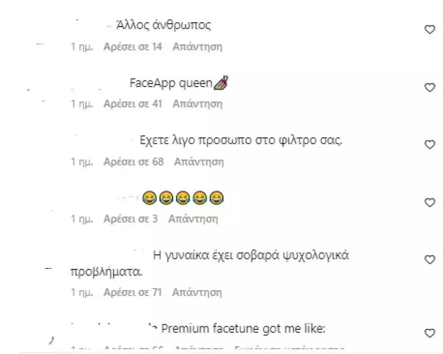 «Τις τελευταίες μέρες παίρνω πολλά μηνύματα ότι έχω αλλάξει εμφανισιακά και γιατί επεξεργάζομαι τόσο πολύ τις φωτογραφίες, γιατί βρίσκομαι στην Αμερική και άλλες πολλές ερωτήσεις… Θα σας πω ότι η ζωή είναι δικιά μου, θα κάνω ό,τι θέλω και όπως το θέλω και δεν αφορά κανέναν από εσάς. Σας ευχαριστώ πολύ. Πολλά φιλιά».