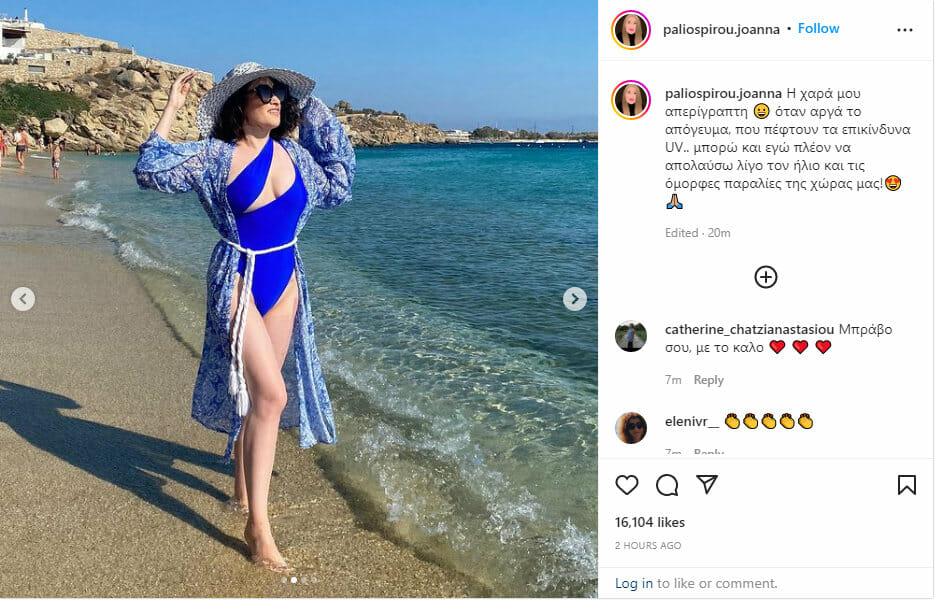 «Η απερίγραπτη χαρά μου όταν αργά το απόγευμα, που πέφτουν τα επικίνδυνα UV, μπορώ και εγώ πλέον να απολαύσω λίγο τον ήλιο και τις όμορφες παραλίες της χώρας μας!», ανέφερε στη λεζάντα.