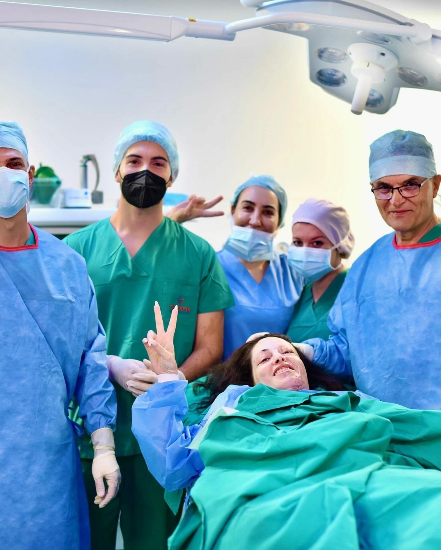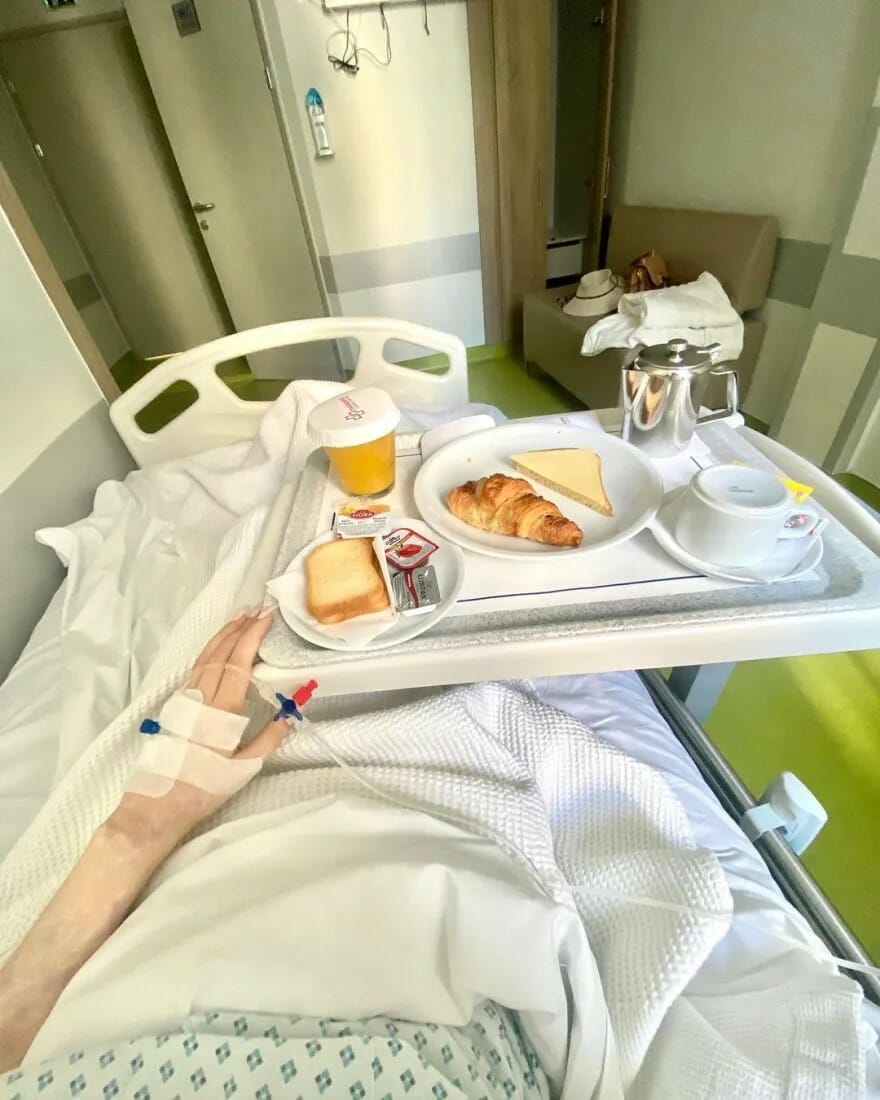 Στις φωτογραφίες από το δωμάτιο του νοσοκομείου της, η Παλιοσπύρου ακολουθεί τις οδηγίες των γιατρών, οι οποίοι μάλιστα ποζάρουν μαζί της ενώ την εξετάζουν.