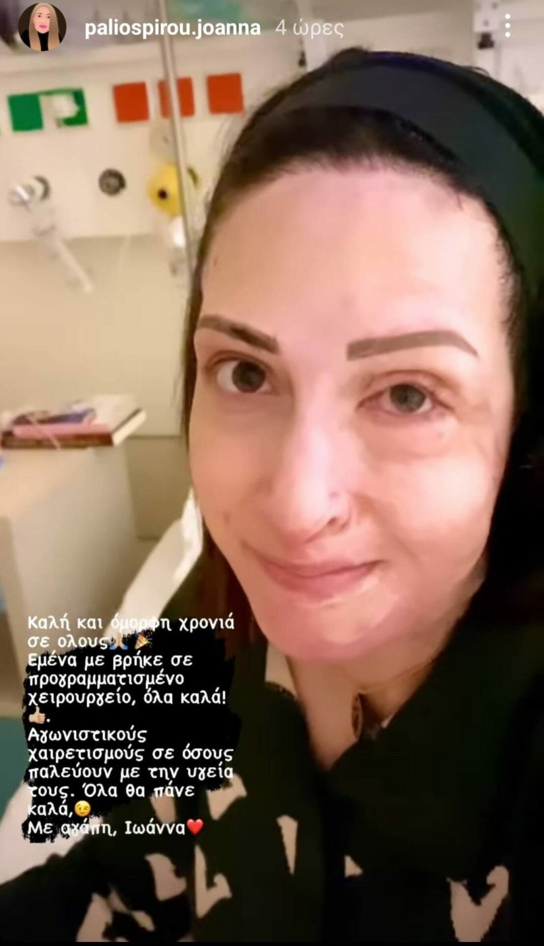 «Καλή και όμορφη χρονιά σε όλους. Εμένα με βρήκε σε προγραμματισμένο χειρουργείο όλα καλά. Αγωνιστικούς χαιρετισμούς σε όσους παλεύουν με την υγεία τους όλα θα πάνε καλά. Με αγάπη Ιωάννα», έγραψε χαρακτηριστικά η Παλιοσπύρου.
