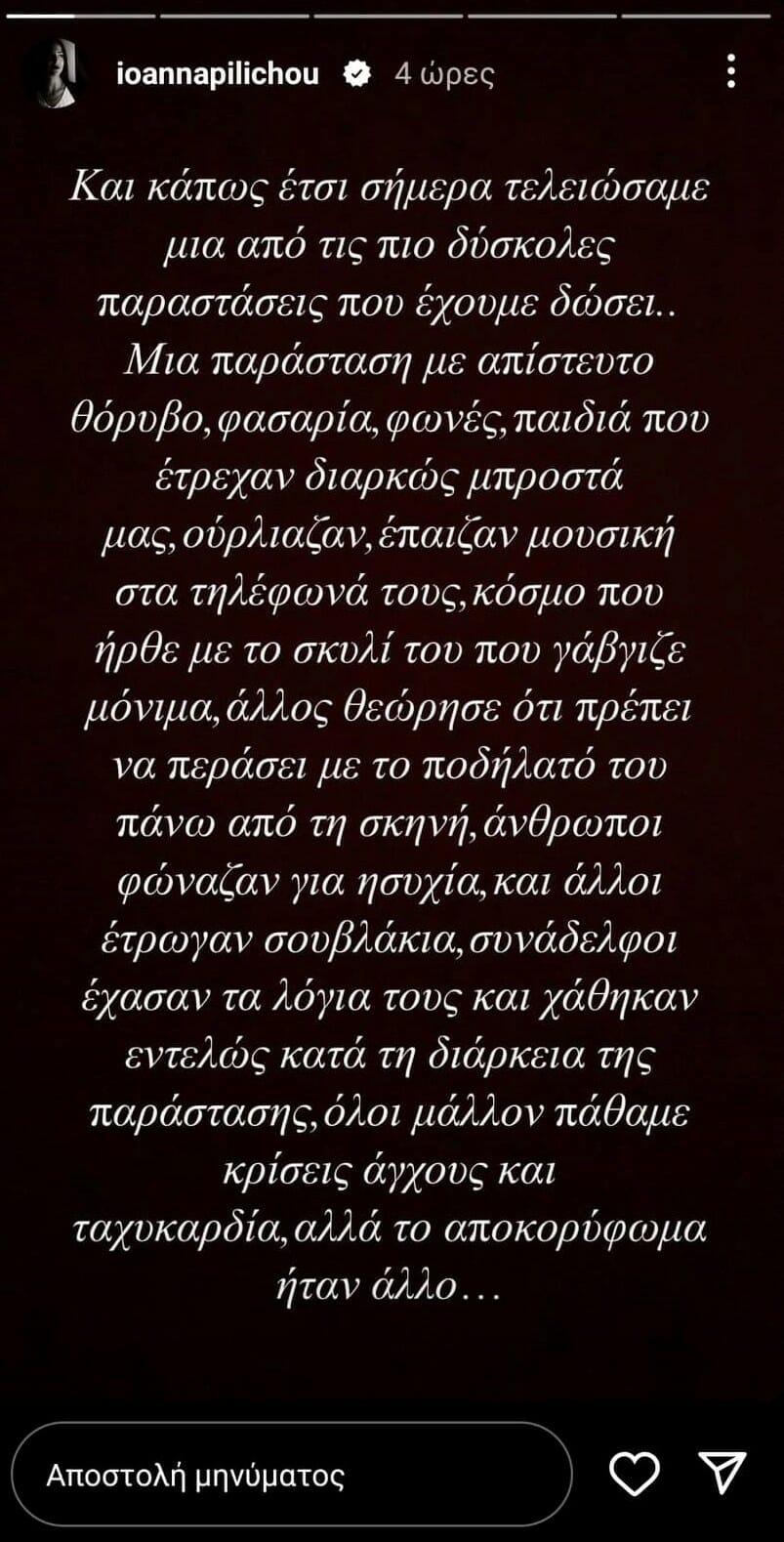 «Και κάπως έτσι σήμερα τελειώσαμε μια από τις πιο δύσκολες παραστάσεις που έχουμε δώσει… Μια παράσταση με απίστευτο θόρυβο, φασαρία, φωνές, παιδιά που έτρεχαν διαρκώς μπροστά μας, ούρλιαζαν, έπαιζαν μουσική στα τηλέφωνά τους, κόσμο που ήρθε με το σκυλί του που γάβγιζε μόνιμα, άλλος θεώρησε ότι πρέπει να περάσει με το ποδήλατό του πάνω από τη σκηνή, άνθρωποι φώναζαν για ησυχία και άλλοι έτρωγαν σουβλάκια, συνάδελφοι έχασαν τα λόγια τους και χάθηκαν εντελώς κατά τη διάρκεια της παράστασης, όλοι μάλλον πάθαμε κρίσεις άγχους και ταχυκαρδία, αλλά το αποκορύφωμα ήταν άλλο.