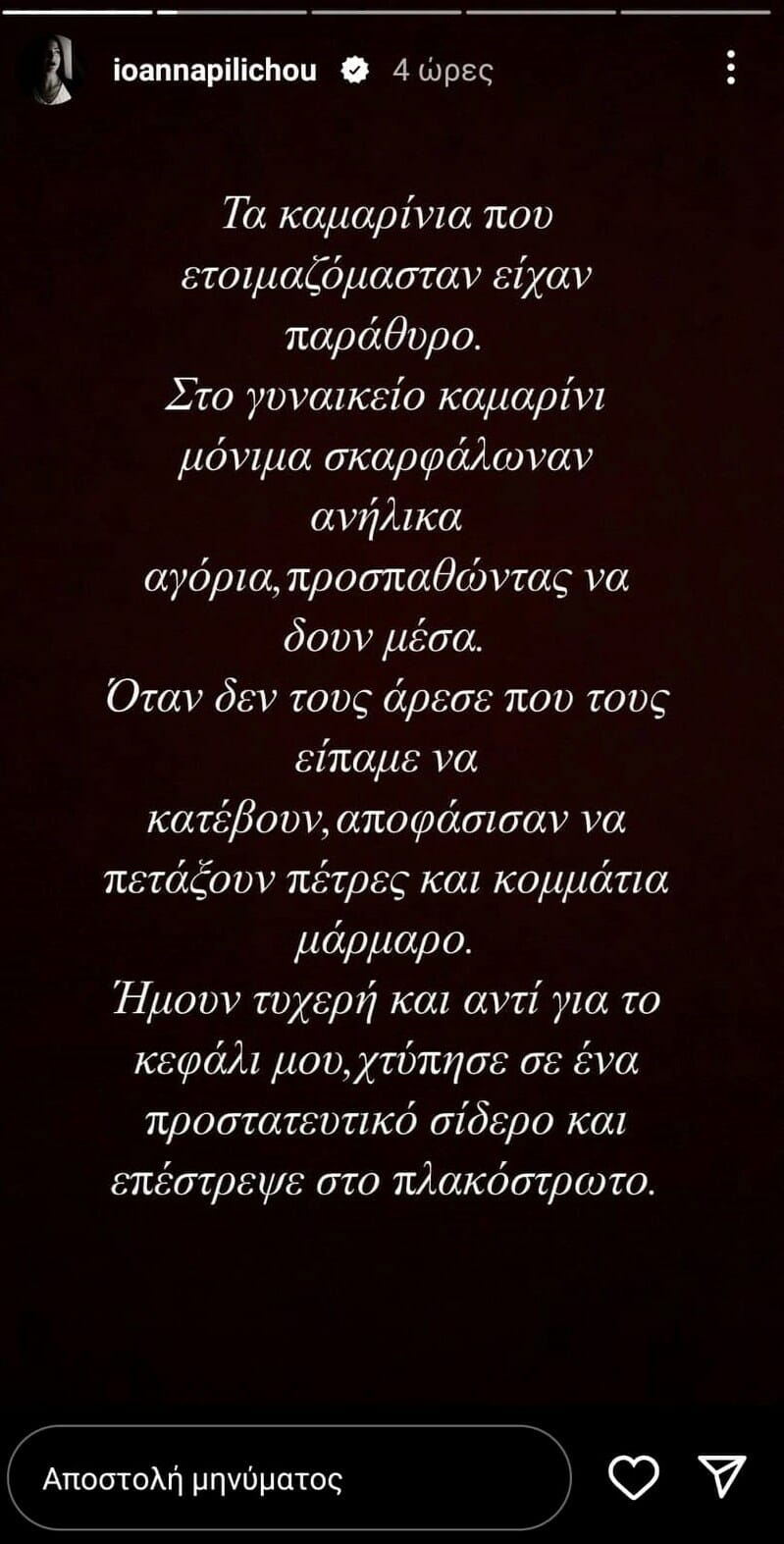 Ένα απαράδεκτο περιστατικό κατήγγειλε η Ιωάννα Πηλιχού με μακροσκελή ανάρτηση στα μέσα κοινωνικής δικτύωσης.