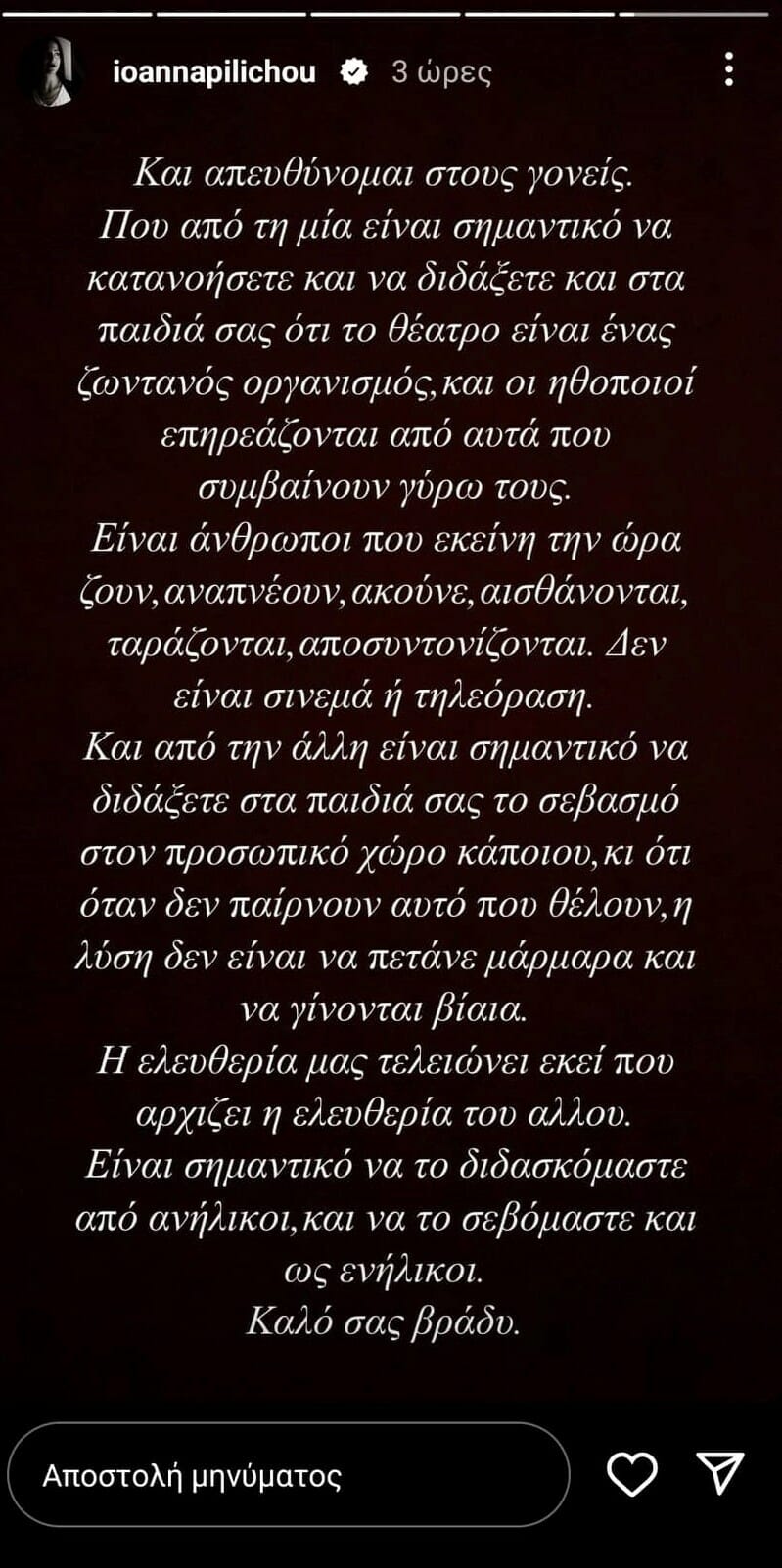 Και από την άλλη είναι σημαντικό να διδάξετε στα παιδιά σας τον σεβασμό στον προσωπικό χώρο κάποιου και ότι όταν δεν παίρνουν αυτό που θέλουν η λύση δεν είναι να πετάνε μάρμαρα και να γίνονται βίαια. Η ελευθερία μας τελειώνει εκεί που αρχίζει η ελευθερία του άλλου. Είναι πολύ σημαντικό να το διδασκόμαστε από ανήλικοι, και να το σεβόμαστε ως ενήλικοι. Καλό σας βράδυ».