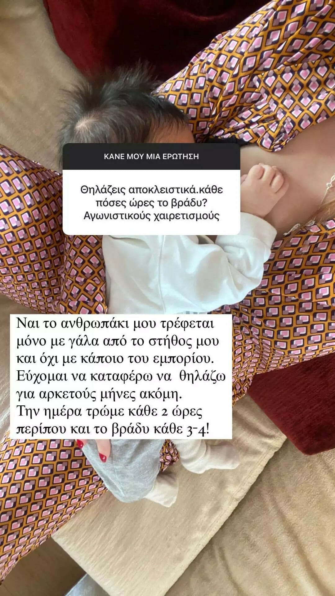 «Δεν έχουν περάσει οι κολικοί μας αλλά κάπως έχουμε βρει τρόπους για να είναι πιο ήπιες οι κρίσεις αυτές. Το ανθρωπάκι μου τρέφεται μόνο με γάλα από το στήθος μου και όχι με κάποιο του εμπορίου. Εύχομαι να καταφέρω να θηλάζω για αρκετούς μήνες ακόμη. Την ημέρα τρώμε κάθε 2 ώρες περίπου και το βράδυ κάθε 3-4».