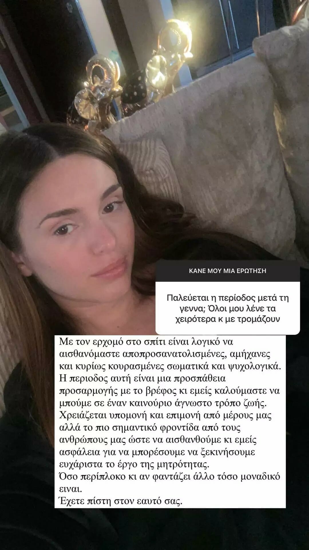 «Με τον ερχομό στο σπίτι είναι λογικό να αισθάνεστε αποπροσανατολισμένες, αμήχανες και κυρίως κουρασμένες σωματικά και ψυχολογικά. Η περίοδος αυτή είναι μια προσπάθεια προσαρμογής με το βρέφος και εμείς καλούμαστε να μπούμε σε έναν καινούργιο άγνωστο τρόπο ζωής.